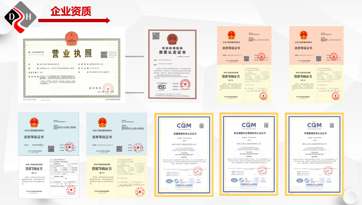 大衡公司持有湖北省市場(chǎng)監(jiān)督管理局評(píng)審中心頒發(fā)的CMA計(jì)量認(rèn)證證書(共340項(xiàng)參數(shù)),具有水利工程檢測(cè)資質(zhì)巖土、混凝土甲級(jí);量測(cè)、金屬結(jié)構(gòu)和機(jī)械電氣類乙級(jí)。業(yè)務(wù)范圍涵蓋水庫(kù)除險(xiǎn)加固、灌區(qū)續(xù)建配套與節(jié)水改造、泵站更新改造、堤防工程、河道治理、農(nóng)村安全飲水、土地復(fù)核等多個(gè)領(lǐng)域,連續(xù)四年承擔(dān)湖北省水利廳水利工程飛檢任務(wù),以誠(chéng)信經(jīng)營(yíng)與專業(yè)服務(wù)樹立行業(yè)口碑。
