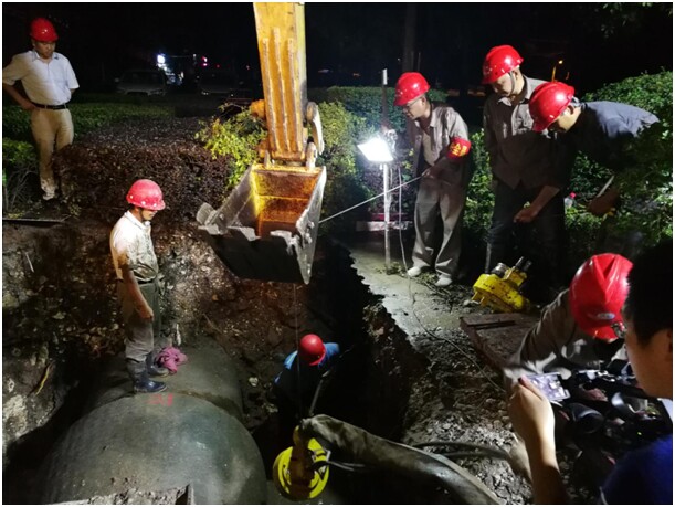 整個(gè)搶修工作安排在15日夜間11時(shí)至16日零晨6時(shí)進(jìn)行。由于爆管段位于掇刀區(qū)白石坡“白石”較多地段,機(jī)械開挖到一定程度后,施工基坑內(nèi)管道底部只能用人工進(jìn)行掏挖,一度給搶修工作造成極大困難。在搶修人員帶水作業(yè)頑強(qiáng)奮戰(zhàn)、不斷努力下,經(jīng)過(guò)18個(gè)小時(shí)的晝夜搶修,在16日零晨4點(diǎn)搶修完畢,按市供水總公司對(duì)社會(huì)服務(wù)承諾時(shí)間,于早上6時(shí)如期恢復(fù)供水。