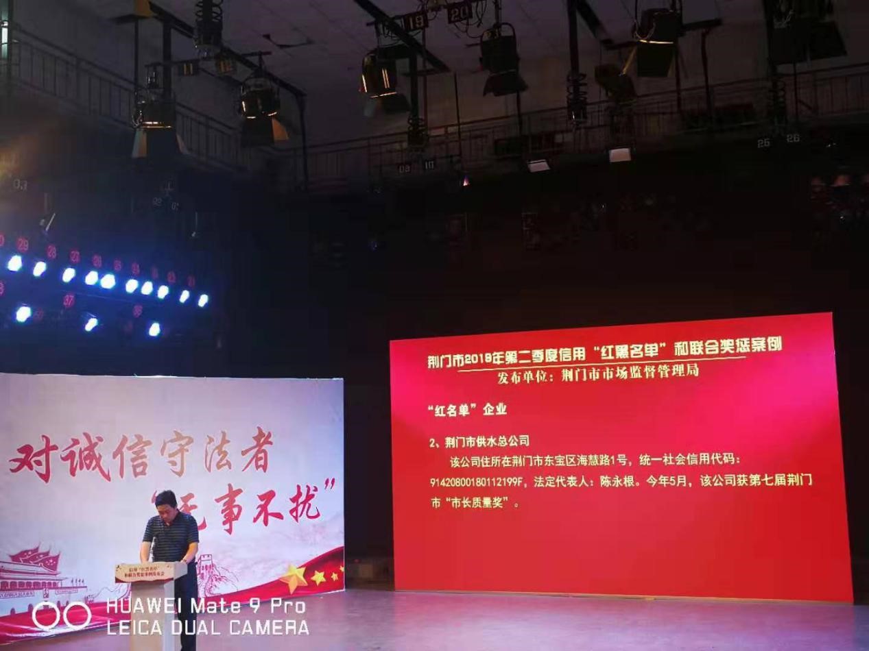 7月24日下午,荊門(mén)市社會(huì)信用體系建設(shè)領(lǐng)導(dǎo)小組辦公室、市發(fā)改委、人行荊門(mén)市中心支行聯(lián)合組織召開(kāi)第二季度信用“紅黑名單”和聯(lián)合獎(jiǎng)懲案例發(fā)布會(huì)。會(huì)上,市供水總公司被授予“全市市場(chǎng)監(jiān)管領(lǐng)域守信企業(yè)”榮譽(yù)稱號(hào),入選荊門(mén)市守信企業(yè)“紅名單”。