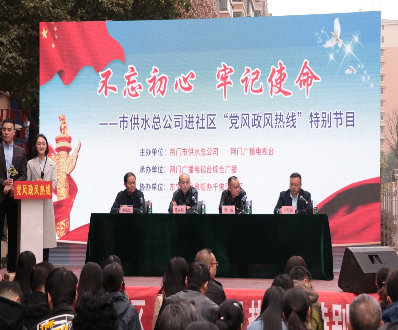 11月 6日上午,由荊門市供水總公司和荊門廣播電視臺(tái)聯(lián)合舉辦的“荊門供水進(jìn)社區(qū)‘黨風(fēng)政風(fēng)熱線’特別節(jié)目”在荊門千佛洞社區(qū)舉行。市供水總公司黨委書記、總經(jīng)理陳永根帶領(lǐng)領(lǐng)導(dǎo)班子相關(guān)成員參加節(jié)目現(xiàn)場(chǎng)(網(wǎng)絡(luò))直播,圍繞“不忘初心、牢記使命”主題教育,傾聽民情民意,接受現(xiàn)場(chǎng)問政,回應(yīng)百姓訴求,解決用戶難題。