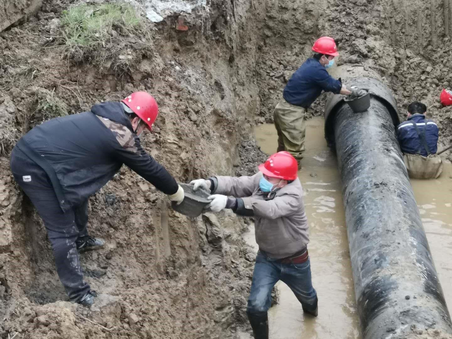 2月23日10時(shí),掇刀區(qū)迎春大道人福藥業(yè)門前DN600mm主供水管道突發(fā)爆管,供水維修部門迅速啟動(dòng)疫情期間應(yīng)急搶修預(yù)案,組織人員、工程機(jī)械、維修設(shè)備趕赴現(xiàn)場(chǎng),經(jīng)過9個(gè)多小時(shí)的緊張搶修,于當(dāng)日晚7點(diǎn)42分恢復(fù)了供水。緊接著次日8點(diǎn),東寶區(qū)科陽路DN600mm主供水管道突發(fā)爆管,巡查人員現(xiàn)場(chǎng)核實(shí)后迅速止水,并及時(shí)通告用戶停水信息后開始倒閘排水,到13時(shí)左右開挖出爆管的DN600的主供水管道出現(xiàn)在大家面前,相比前日的搶修,整段水管因裂口較大損壞嚴(yán)重,不能簡(jiǎn)單修復(fù),只能現(xiàn)場(chǎng)立即制定可靠的管道更換維修方案。當(dāng)時(shí),全部工作人員從早上到現(xiàn)場(chǎng)已經(jīng)工作了5個(gè)小時(shí),滴水未進(jìn),但大家為保障搶修進(jìn)度,仍然堅(jiān)持一邊加班加點(diǎn)對(duì)基坑進(jìn)行處理,一鼓作氣將破損管道清理出來,做好對(duì)接管道的清淤工作。另一邊搬運(yùn)快干水泥,切割、加工、運(yùn)輸、吊裝管道,14點(diǎn)35分把全部材料物資運(yùn)抵現(xiàn)場(chǎng)開始作業(yè)。隨后,大家在泥地里匆匆啃了幾口方便面后,又投入到緊張的搶修工作中,終于在18點(diǎn)17分完成了維修,待水泥養(yǎng)護(hù)好后,于21點(diǎn)27分通水,及時(shí)保障了科陽路企業(yè)和周邊居民的正常生產(chǎn)生活用水。