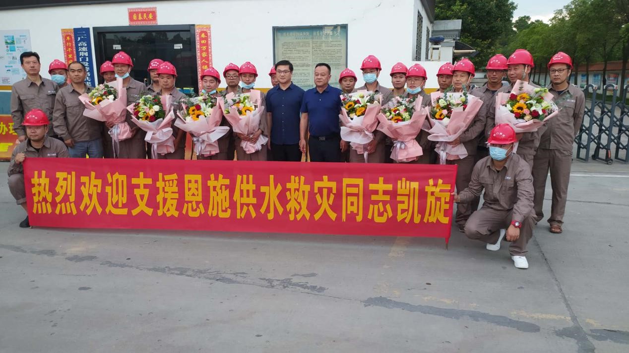 回想起赴恩施市的六天時(shí)間應(yīng)急供水救援經(jīng)歷,應(yīng)急供水救援隊(duì)隊(duì)長(zhǎng)、維修公司副經(jīng)理羅紅勝回憶到,面對(duì)洪災(zāi)侵襲,大家總是在披星戴月與時(shí)間賽跑,連軸戰(zhàn)斗,一處受損設(shè)備、斷裂管道剛剛修復(fù),來不及休息,馬不停蹄又趕往下一個(gè)搶修點(diǎn)。他感慨地表示,赴恩施市救援不管怎么艱苦也沒什么,留下深刻的印象是特別熱情的當(dāng)?shù)厥忻袢罕姾退麄兊恼嬲\(chéng)謝意。赴恩救援期間,公司黨委也十分關(guān)心8名灰衣甲士的后勤保障工作。7月25日下午,黨委書記、總經(jīng)理陳永根,黨委副書記、紀(jì)委書記徐黎明,黨委委員、總會(huì)計(jì)師劉高軼出差路過恩施期間專程慰問作戰(zhàn)人員,并要求公司相關(guān)部門全力做好住宿、就餐等后勤保障工作。