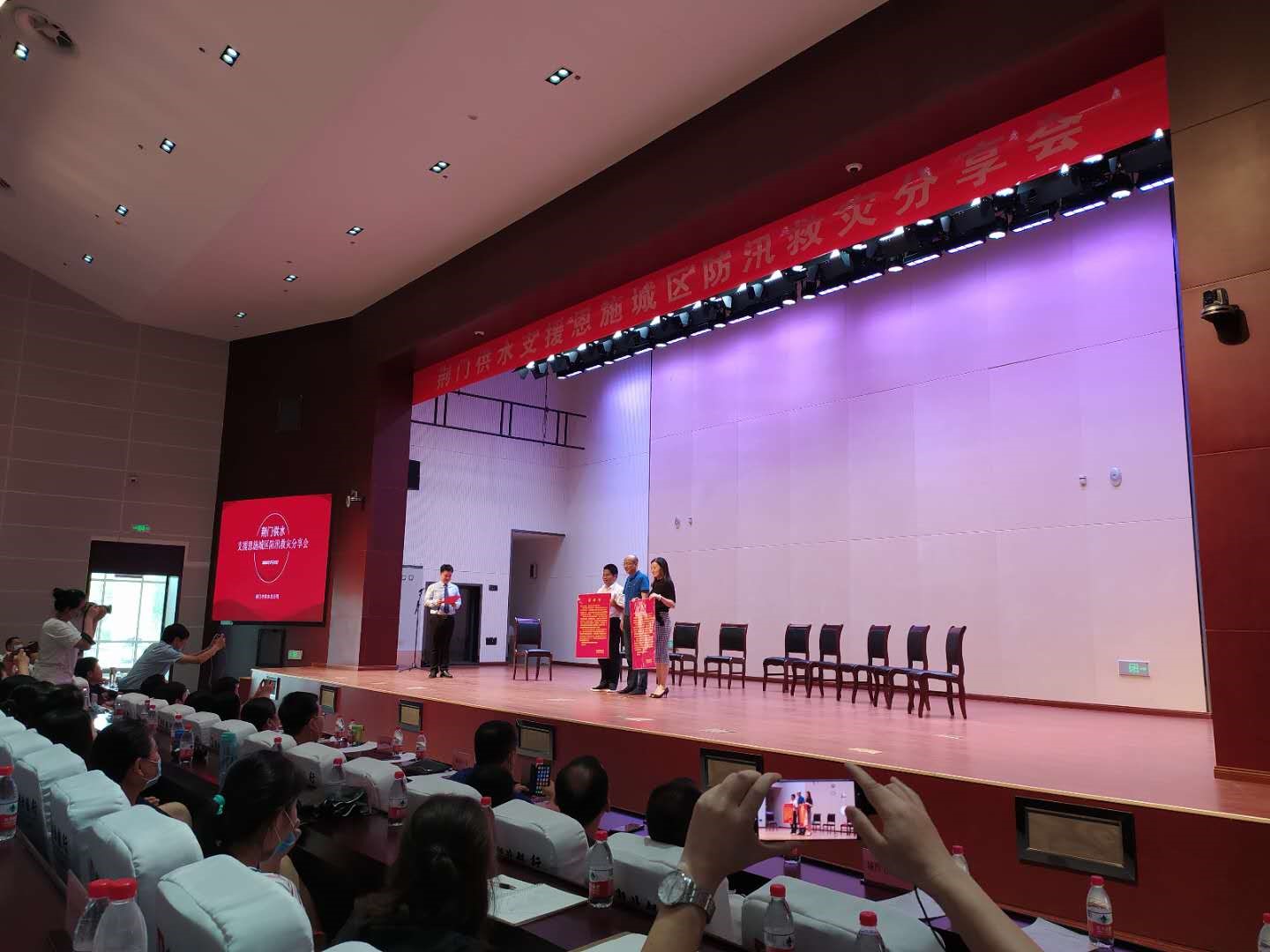 7月31日下午,市供水總公司在荊門劇院舉行支援恩施城區(qū)防汛救災分享會,表彰支援恩施城區(qū)防汛救災中的先進個人,進一步激發(fā)全員干事創(chuàng)業(yè)工作熱情,營造公司上下創(chuàng)先爭優(yōu)工作氛圍。市城控集團黨委副書記張本華、上海連城集團有限公司荊門辦事處總經(jīng)理吳彬婷、奇力士(武漢)智慧水務科技有限公司董事長畢濤應邀出席會議,公司黨委班子全體成員,中層干部、班組長和機關全員、年輕職工代表等160余人參加會議。