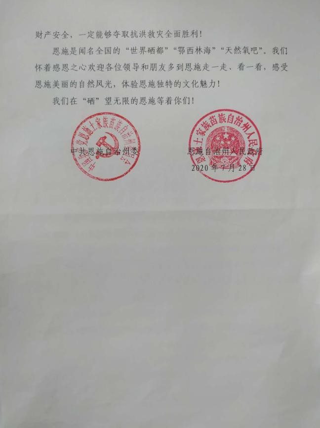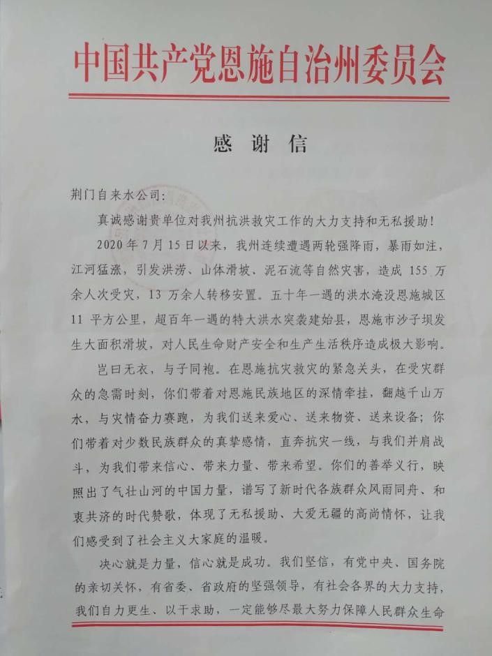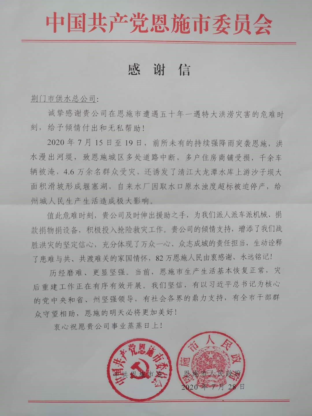 近日,恩施州委、州政府和恩施市委、市政府分別向市供水總公司發(fā)來感謝信,對該公司在恩施遭遇五十年一遇特大洪澇災(zāi)害的危難時刻給予傾情付出和無私幫助表示感謝。